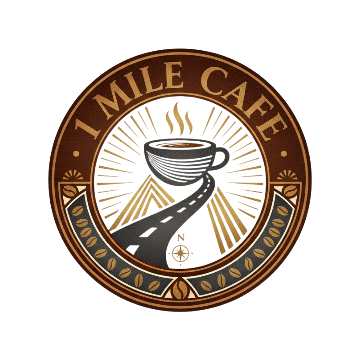 Circular One Mile Cafe logo in brown and gold tones featuring a steaming coffee cup above a winding road leading toward mountains, surrounded by coffee beans and a compass symbol at the bottom.