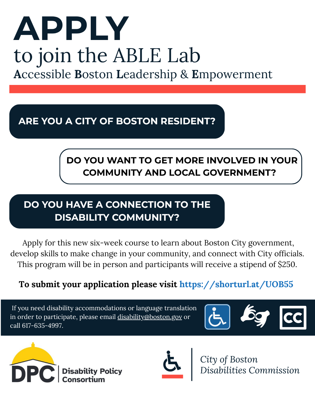 Alt Text: Flyer advertising the ABLE Lab with partner logos. Apply to join the ABLE Lab: Accessible Boston Leadership & Empowerment. Are you a City of Boston resident? Do you want to get more involved in your community and local government? Do you have a connection to the disability community? Apply for this new six-week course to learn about Boston City government, develop skills to make change in your community, and connect with City officials. This program will be in person and participants will receive a stipend of $250. To submit your application please visit https://shorturl.at/UOB55. If you need disability accommodations or language translation in order to participate, please email disability at boston.gov <mailto:disability at boston.gov> or call 617-635-4997. Presented by Disability Policy Consortium and the City of Boston Disabilities Commission.