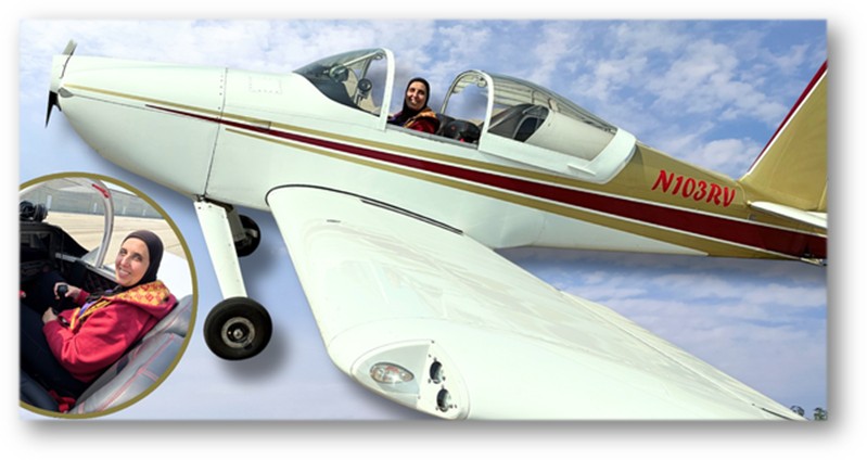 Image description: A small white plane with red and gold details angled as if taking off with President Othman seated in the cockpit. A small round image to the left shows President Othman sitting inside the plane with her hands on the control stick. The background is a soft sky with clouds.