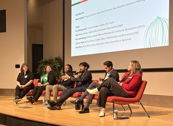 Rico (center, holding microphone), joined City Council President Joy Hollingsworth, Office of Economic Development Acting Director Beto Yarce, and Washington State Department of Agriculture Director of Food Systems Initiatives Katie Rains for a town hall conversation at the Seattle Food Summit. The panel was moderated by Mariah DeLeo of the Good Business Network of Washington.