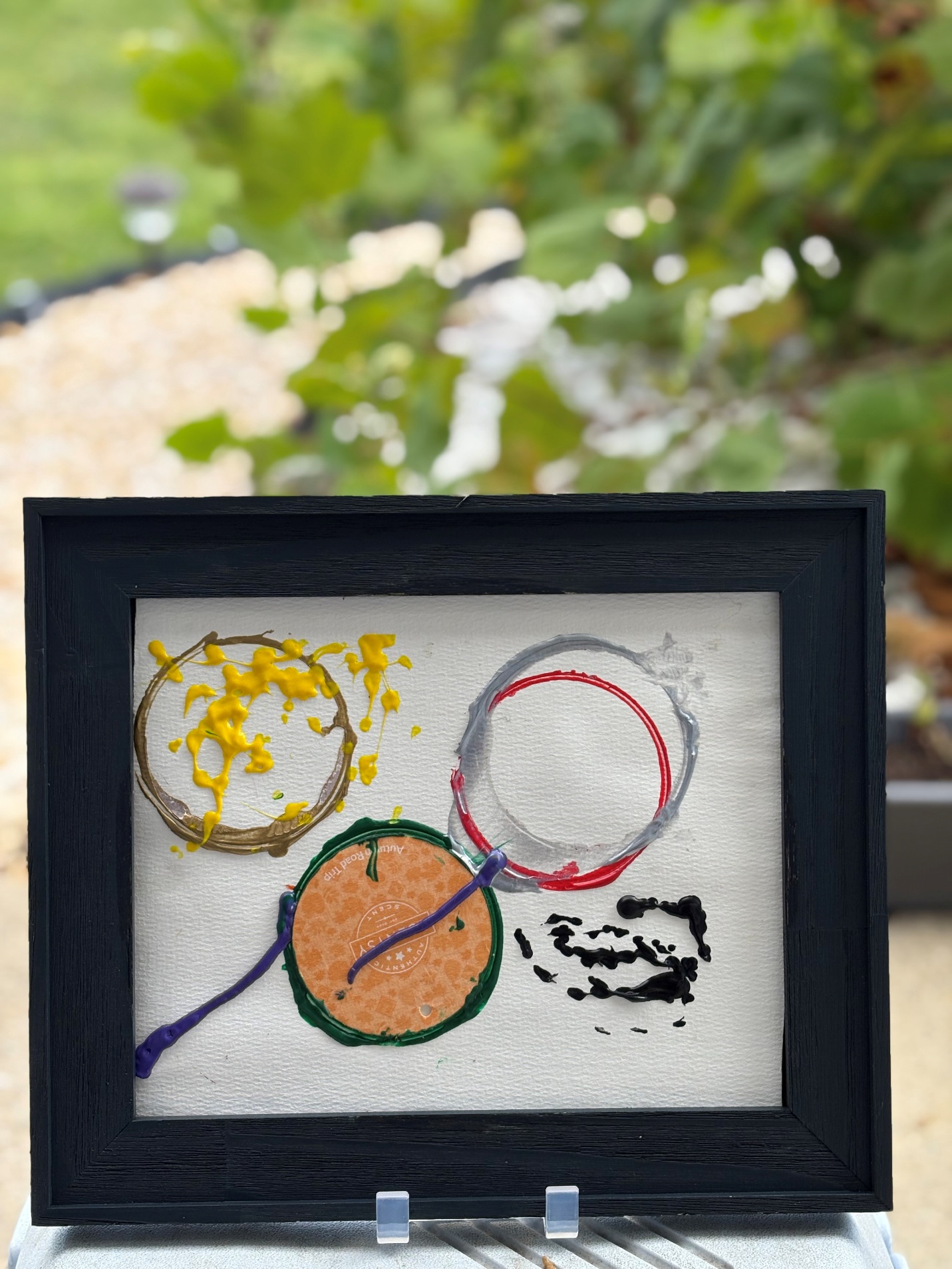 > Until next time![image: A white painting framed in black wood.Circles of