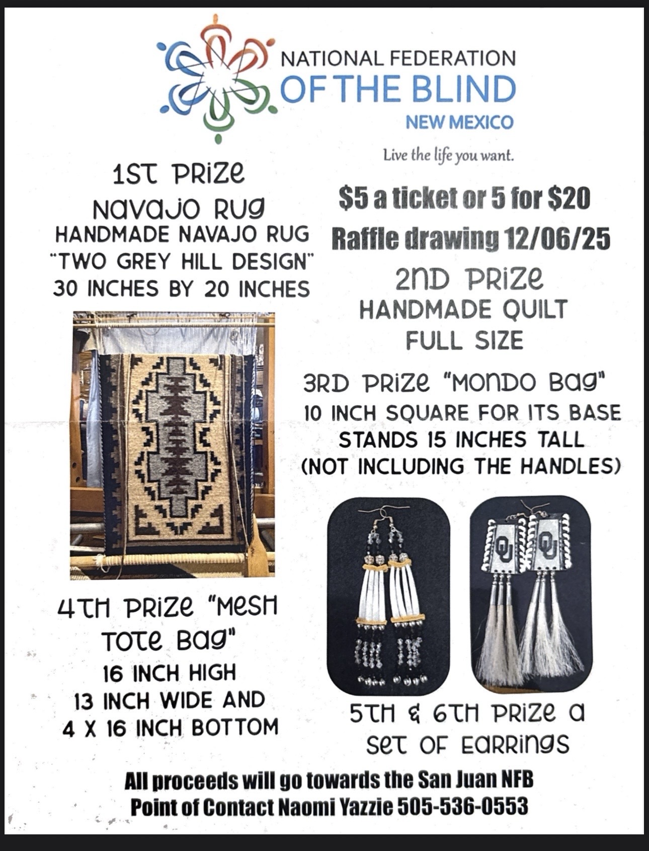 Tickets cost $5 each or 5 for $20. The raffle drawing is on 12/06/25. Proceeds support the NFBNM San Juan Chapter.